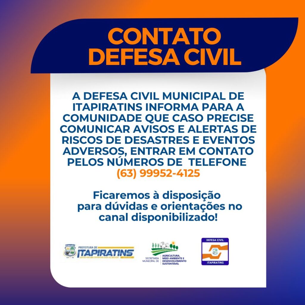 A Defesa Civil de Itapiratins informa à população que está disponível um canal direto de comunicação para avisos, alertas de riscos de desastres e outros eventos adversos.